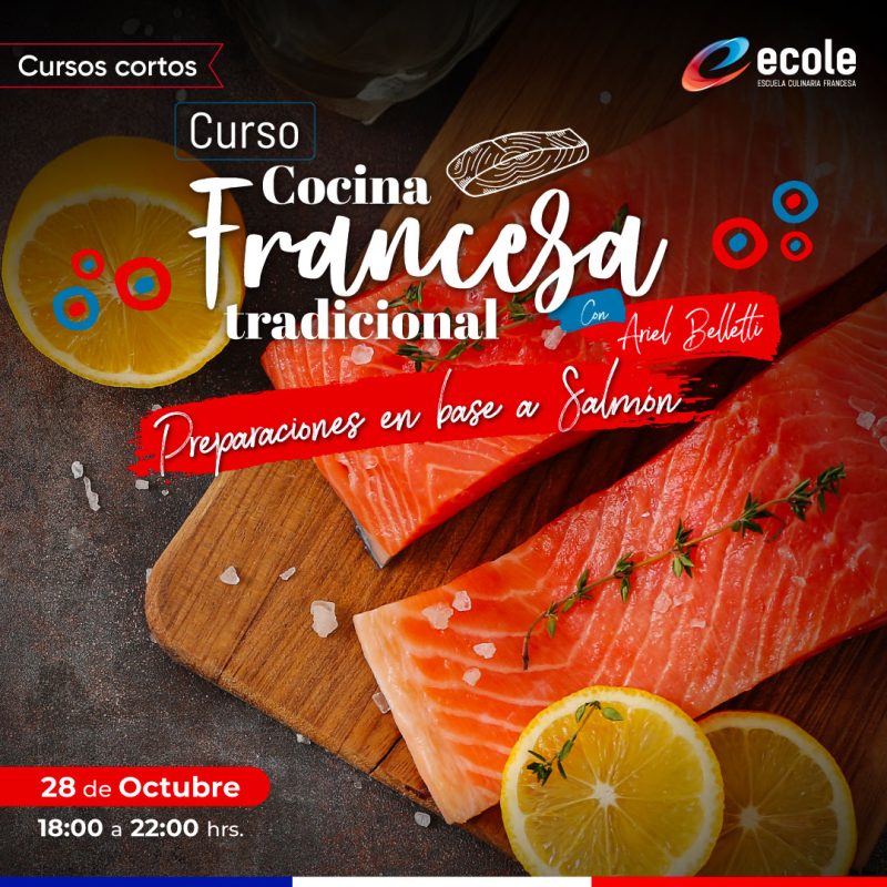 Fecha: 28 de octubre de 2025. Hora: 18:00 a 22:00 hrs. Dirigido a: Amantes de la buena gastronomía, que quieran aprender de las bases de la cocina francesa y algunas de sus técnicas y preparaciones más clásicas y deliciosas en base a salmón. Los invitamos a adentrarse en un mundo de sabores. No es necesario tener experiencia previa. Cupos totales: 15