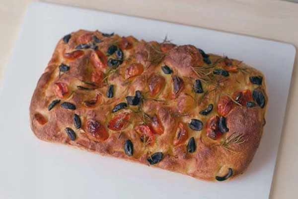 Amasado mejorado: Todos los ingredientes menos el aceite de oliva y el agua de bassinage. 4’ en 1era velocidad + 5’ en 2da velocidad. Bassinage con aceite de oliva hasta incorporar. Pointage: 1h30’ con pliegue (rabat) después de 30 minutos. Pesado: Détente: Façonnage: Apprêt: Cocción: 2000g, o lo que requiera el molde. 15’. Estirar la masa con la punta de los dedos en un molde o placa del tamaño deseado. Pintar con aceite de oliva y hacer agujeros con la punta de los dedos. Garnitura con aceitunas, romero, tomillo y sal gruesa. Pueden variar los tipos de garnitura y sus cantidades a gusto. 60’ a 24° entre 70% y 80% de humedad. 230° a 240° hasta dorar, depende del tamaño de la focaccia.